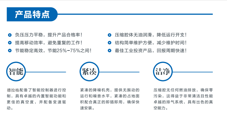 德拉格(常州)機械科技有限公司是一家專業從事螺桿式空氣壓縮機的研發、生產和銷售的大型企業。 我們選用歐洲新型線主機及零部件,嚴格遵循ISO9001質量管理體系要求。我們生產的產品包括重載型空壓機;中高壓空壓機:標準型空壓機;靜音式變頻空壓機;無油永磁變頻空壓機;低壓節能式空壓機;工程配套空壓機醫用無油空壓機;離心式空壓機;特殊定制空壓機;激光切割專用空壓機;鼓風機;制氮機;制氧機;不銹鋼過濾器;不銹鋼壓力罐;不銹鋼冷干機;氮氣罐。其中一體式永磁變頻系列取得多項國家專利,產品達到國家級能效標準。